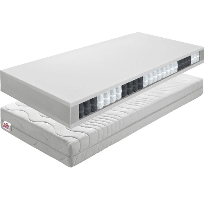 Jádro matrace tvoří taštičkové pružiny vyrobené z vysoce kvalitního drátu, které se nacházejí v oddilených taštičkách, cožzvyšuje elasticitu a přizpusobivost matrace (efekt "vodní postele"). Páteř se díky tomu přirozeně ukládá do tvaru písmene "S",což zajišťuje vysoký komfort spánku, pružinové jádro je oboustrannš obložené stlačenou plstí a polyuretanovou pěnou T25 -25 mm se zvýšenou pružností, potah je dostupný ve verzi alergik, který je vyroben z čalounické látky froté, oboustranněprošívané dutým vláknem 200g/m2 a ve verzi aloe vera, oboustranně prošitý jokem 400g/m2, Zip umožňuje složení potahu apraní při teplotě do 60 ° C