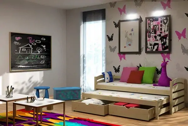 Masivní dřevěná postel s výsuvným lůžkem na spaní pro druhou osobu.Je to skvělé řešení jak pro rodiče, kteří chtějí být v noci dětem nablízku, tak i pro sourozence nebo návštěvu.